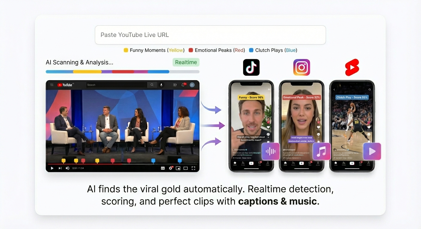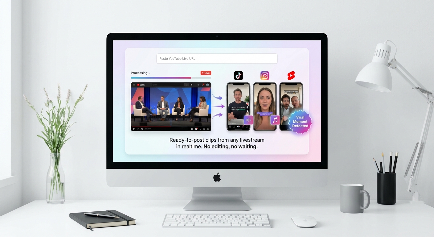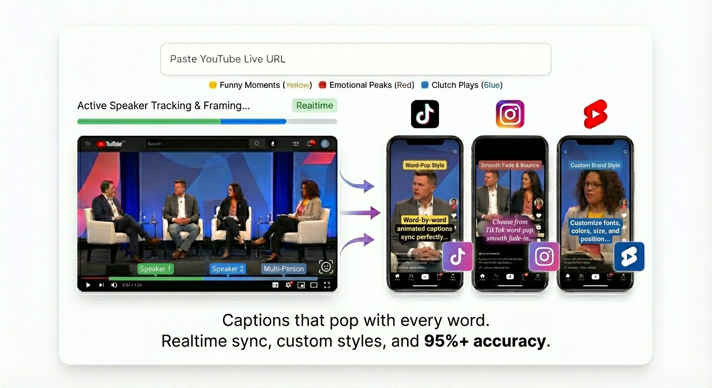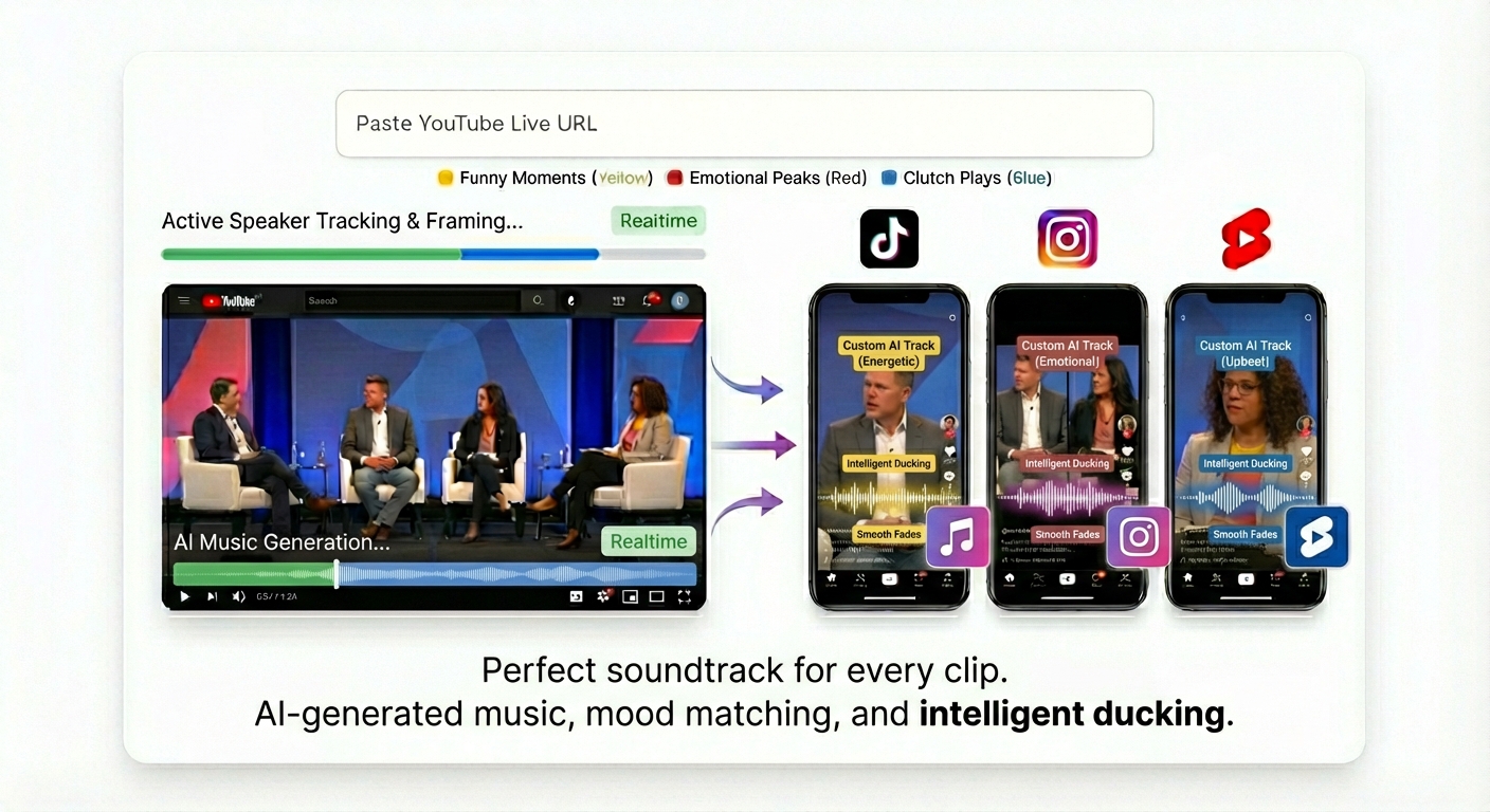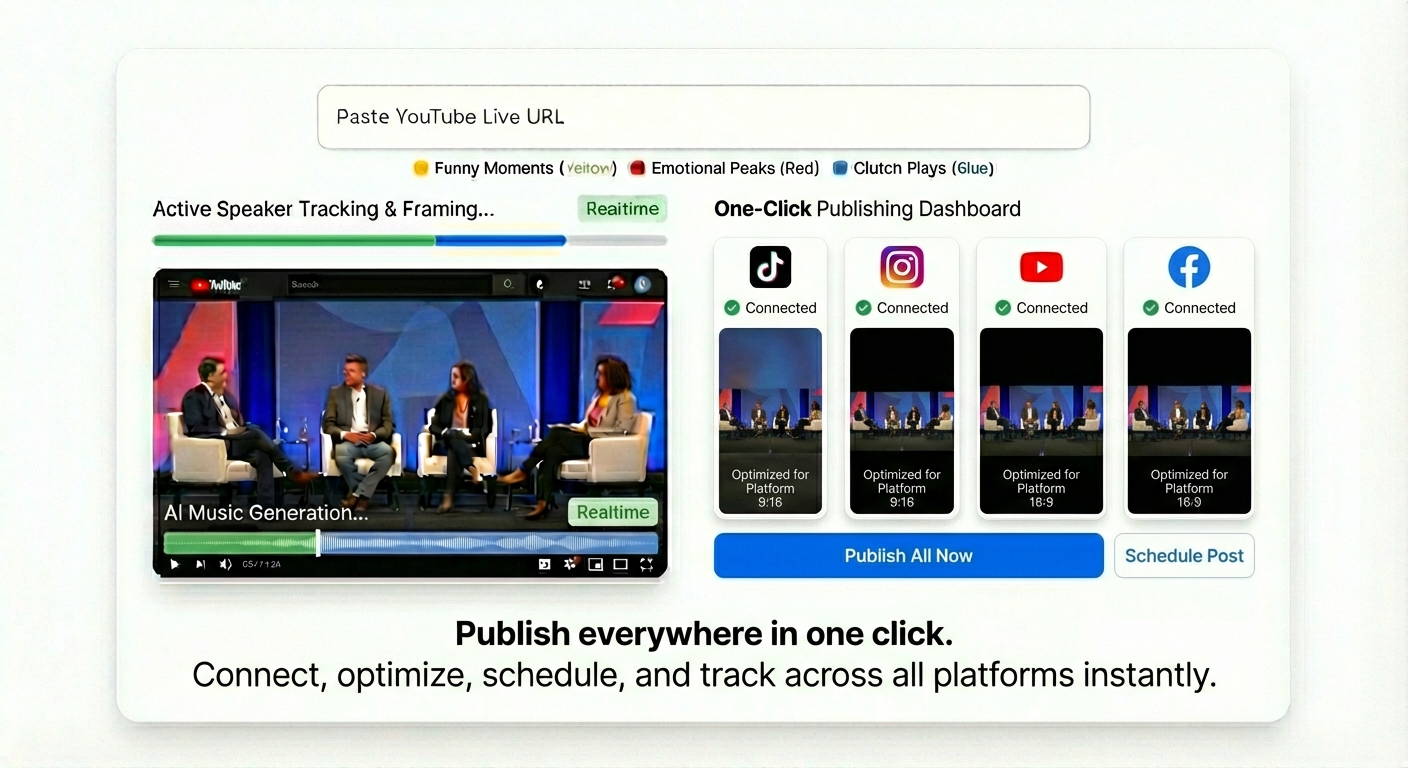 AI turns podcasts, livestreams, and long videos into scroll-stopping YouTube Shorts, TikToks & Reels, with captions and music, ready to post in minutes.