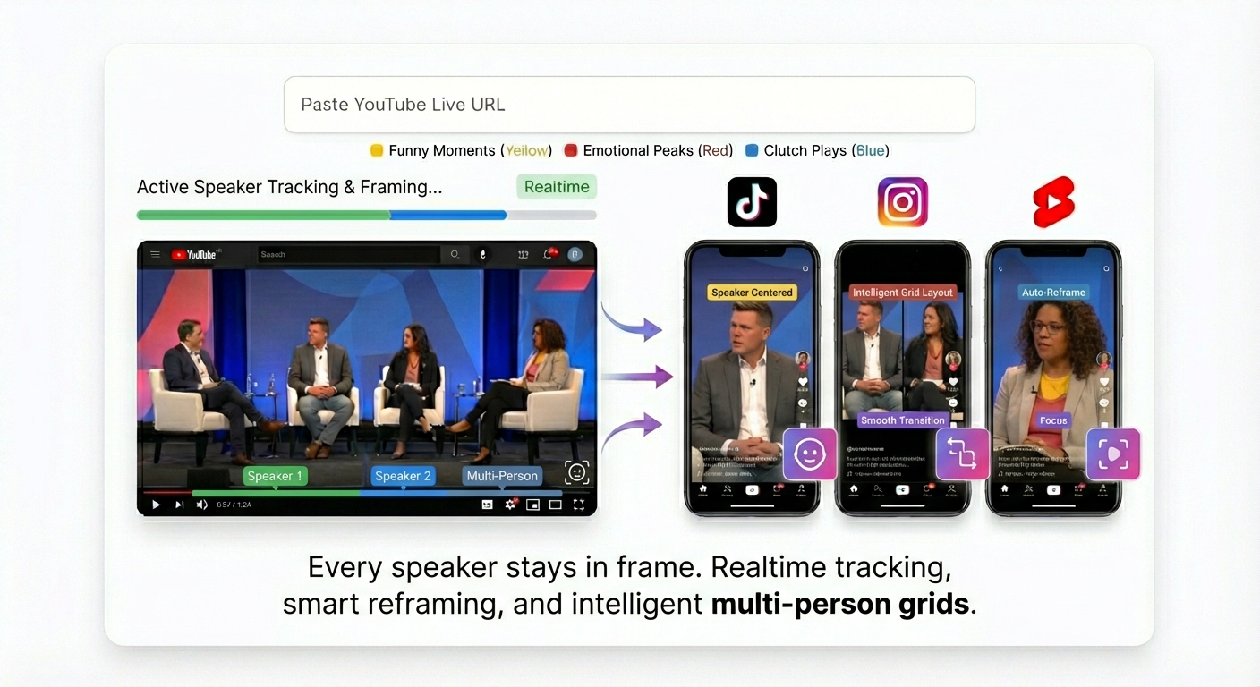 Our active speaker detection tracks faces frame-by-frame, keeping speakers perfectly centered as they move. Vertical clips frame the active speaker automatically. Multi-person content gets intelligent grid layouts. Smooth transitions between speakers feel natural, not jarring. From podcasts to panel discussions to solo streams, your subjects stay in focus without manual cropping.